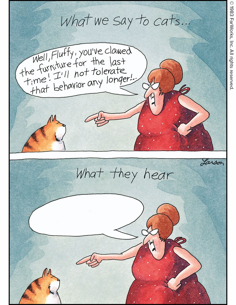 What we say to cats … / Well, Fluffy, you’ve clawed the furniture for the last time! I’ll not tolerate that behavior any longer! … / What they hear / (empty balloon)