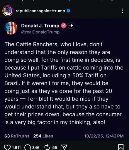 Florencia (she/her)@lemmy.blahaj.zone to Progressive Politics@lemmy.worldEnglish · 15 days agoStop bitching ranchers. Y'all starting to sound like a bunch of libslemmy.blahaj.zoneimagemessage-square23linkfedilinkarrow-up1362arrow-down16