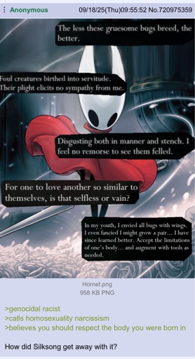 arrow-up1201arrow-down1imageAnon thinks Silksong is problematicsh.itjust.works🍹Early to RISA 🧉@sh.itjust.worksM to Greentext@sh.itjust.works · 1 month agomessage-square14linkfedilink