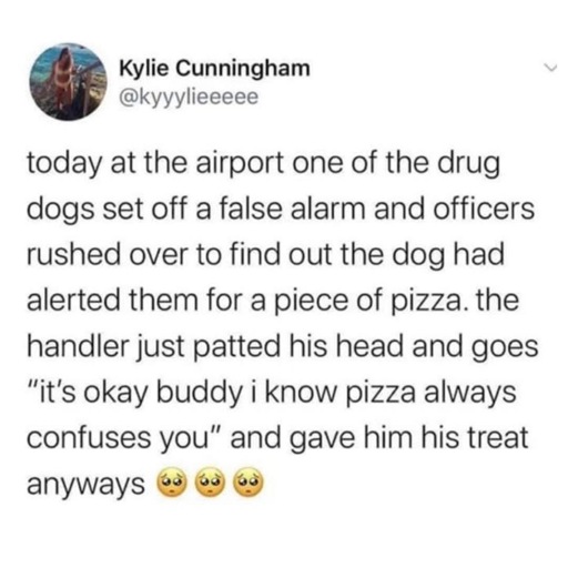 A Twitter post by Kylie Cunningham @kyyylieeeee that reads “today at the airport one of the drug dogs set off a false alarm and officers rushed over to find out the dog had alerted them for a piece of pizza. the handler just patted his head and goes “it’s okay buddy i know pizza always confuses you” and gave him his treat anyways.”