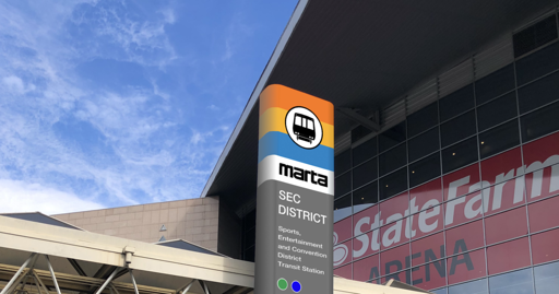 A revised MARTA pylon sign outside the Atlanta Hawks’ arena. Courtesy of MARTA