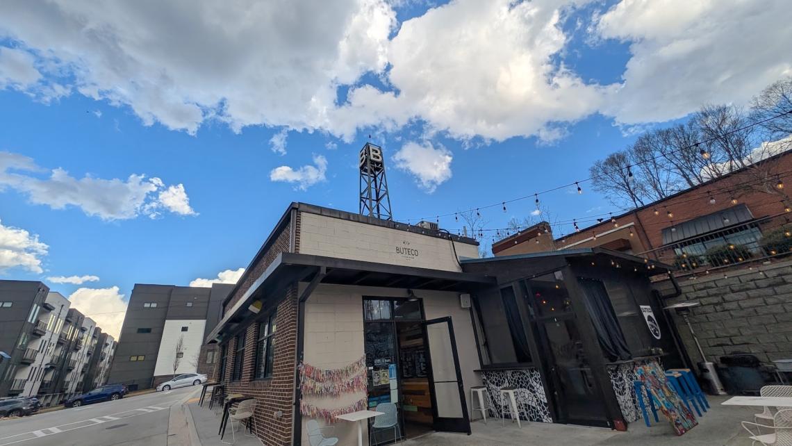 Front patio of longstanding tenant Buteco beneath The Beacon’s landmark signage. Josh Green/Urbanize Atlanta